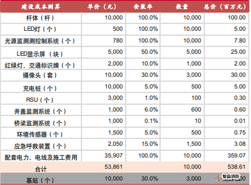 以10000根燈桿為例,進(jìn)行運營業(yè)務(wù)規(guī)模測算。首先,參考落地項目對智慧燈桿建設(shè)成本進(jìn)行測算。預(yù)計總成本為5.39億元,平均建設(shè)成本為每桿5.39萬元。